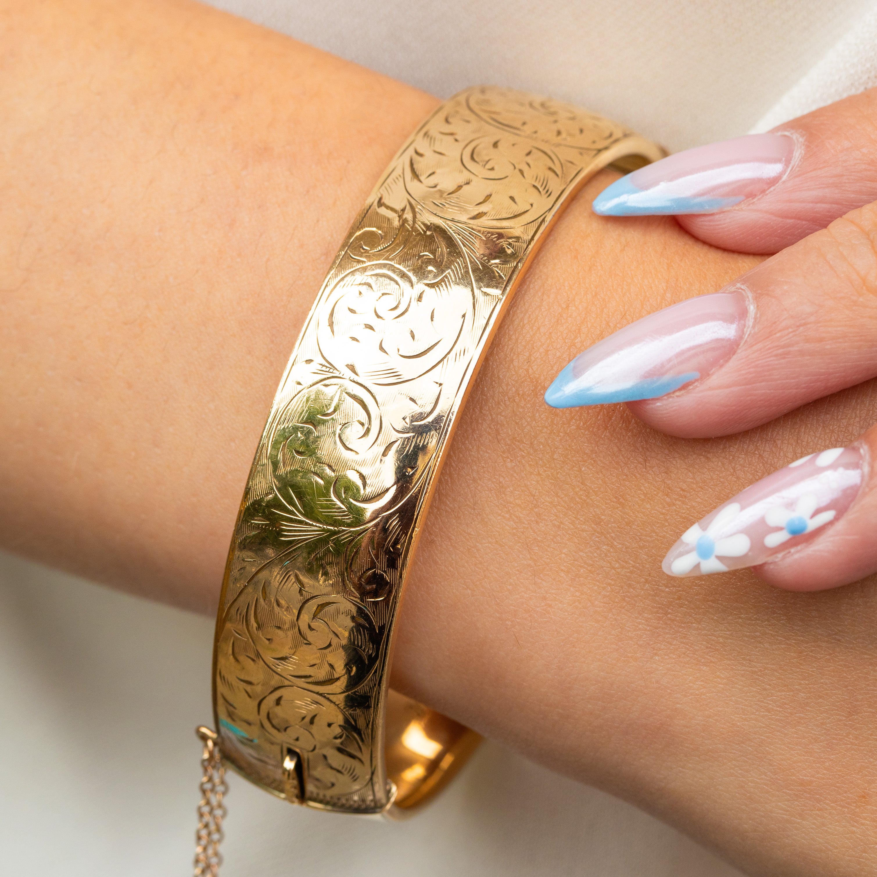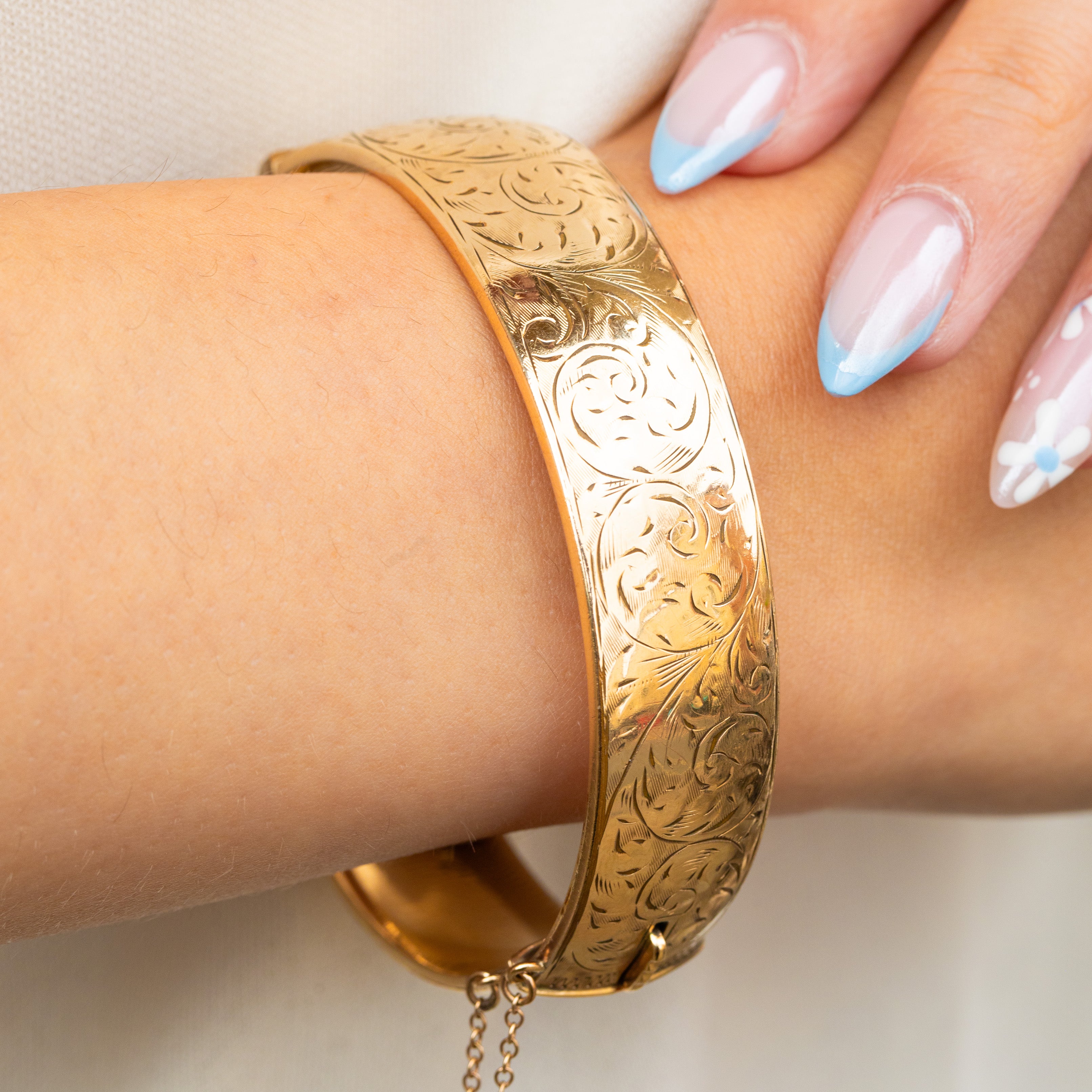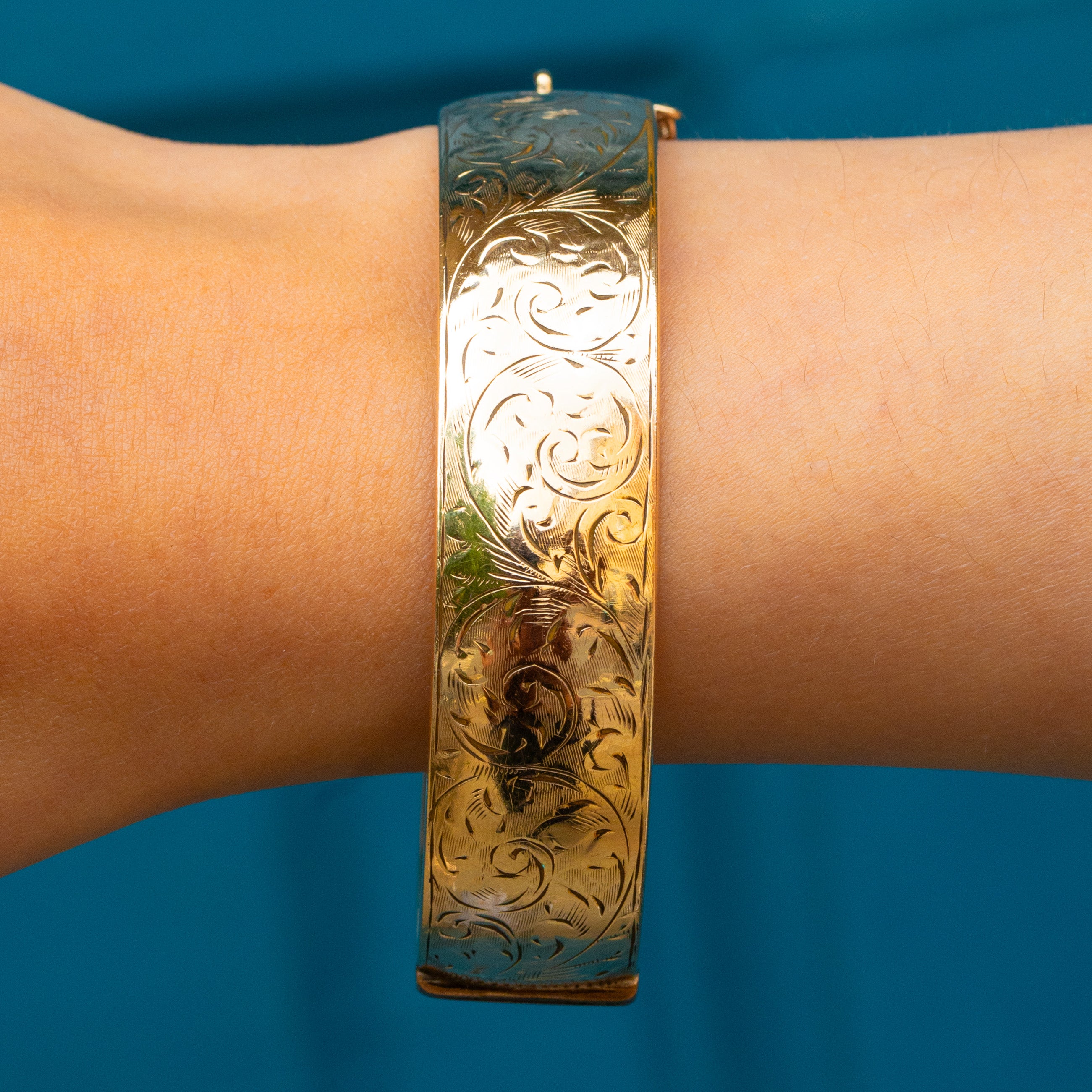 This vintage 9ct rolled Gold bangle is the perfect summer staple! The front of the bangle has been engraved with swirl motifs, giving this vintage piece a feminine edge.