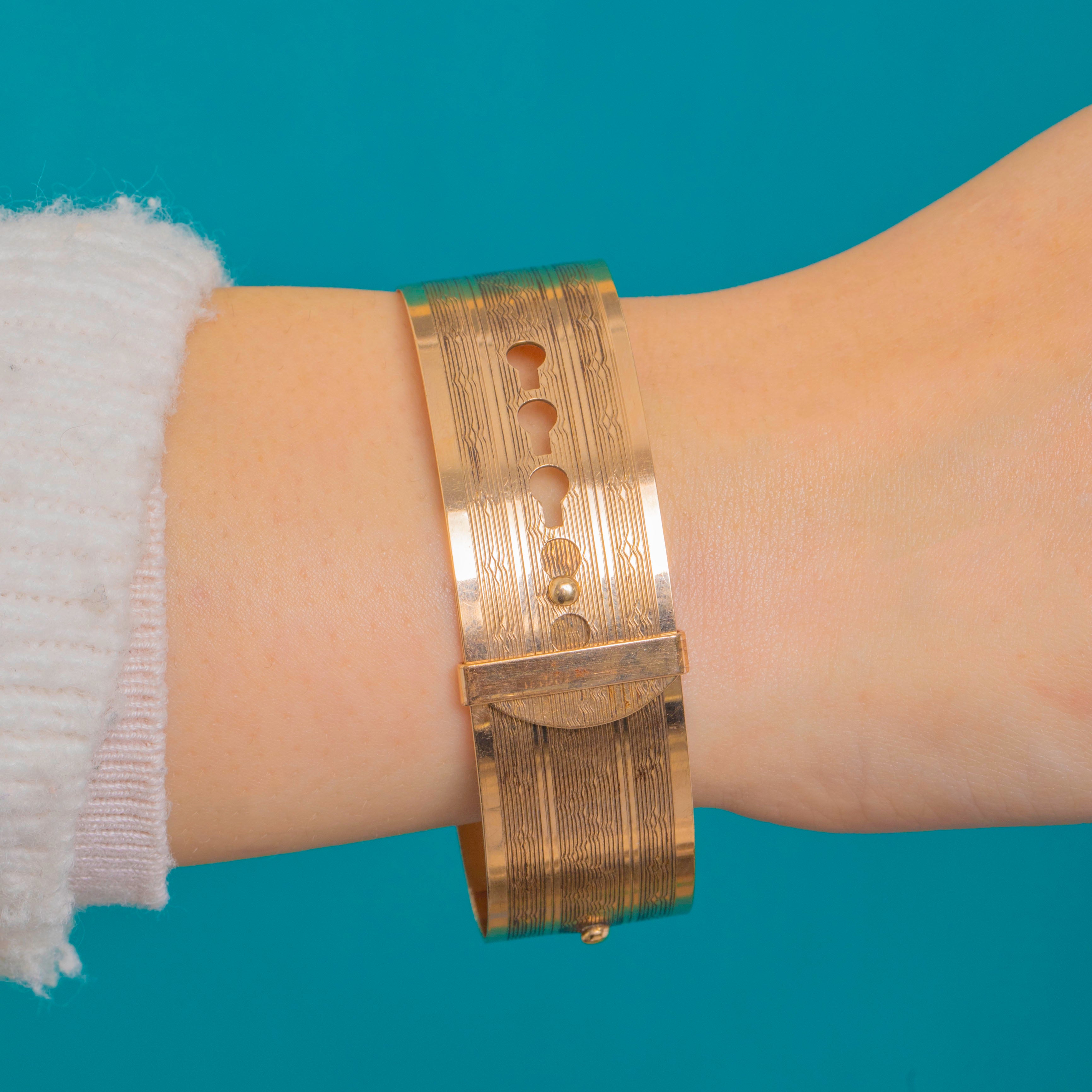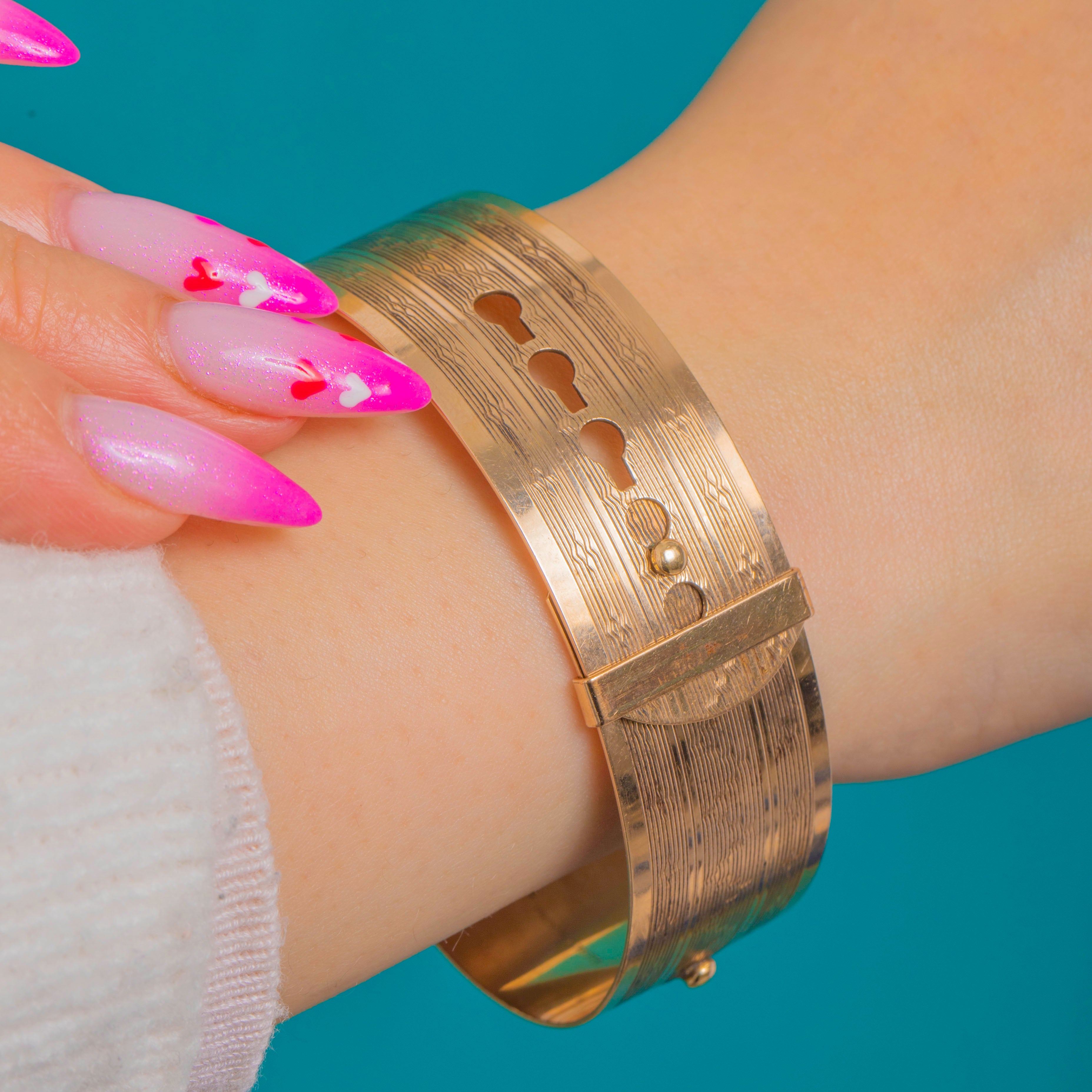 Markant und dennoch makellos elegant präsentiert sich dieses Armreif-Modell aus der mittleren 20. Jahrhunderts in 9 Karat Walzgold mit einer breiten, architektonischen Silhouette. Das zentrale Feld ist reich maschinell graviert mit klaren, parallelen Linien, die das Licht auf eindrucksvolle Weise einfangen, akzentuiert durch eine senkrechte Reihe von Schlüsselloch-Aussparungen für die klassische Gürtelschnallen-Optik.