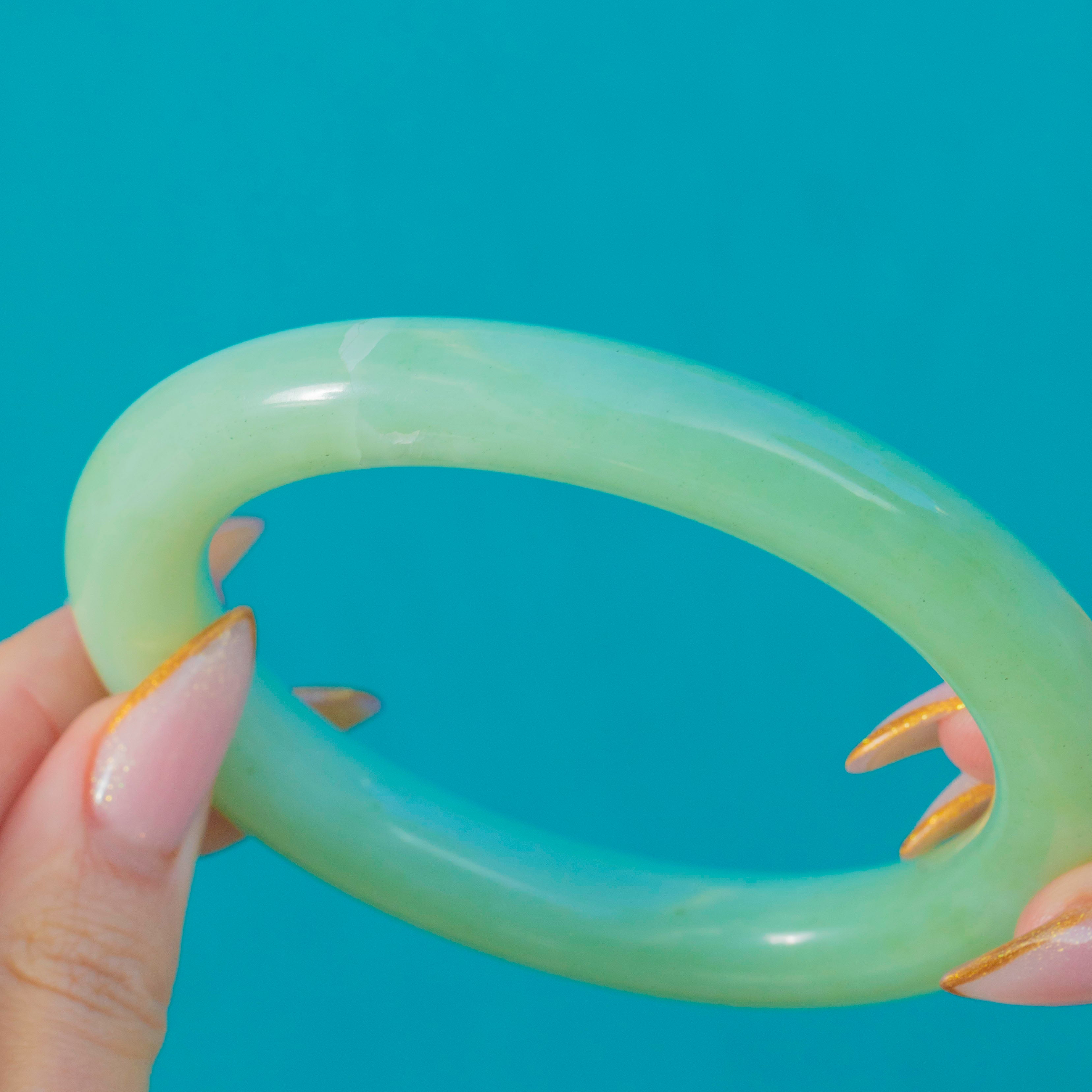 VERY GOOD: The Jade has a smooth, glossy polish with gentle age wear. There is a surface crack along the outer line of the bangle, but it remains structurally secure and fully wearable. No chips or breaks, and the piece retains excellent colour and presence.