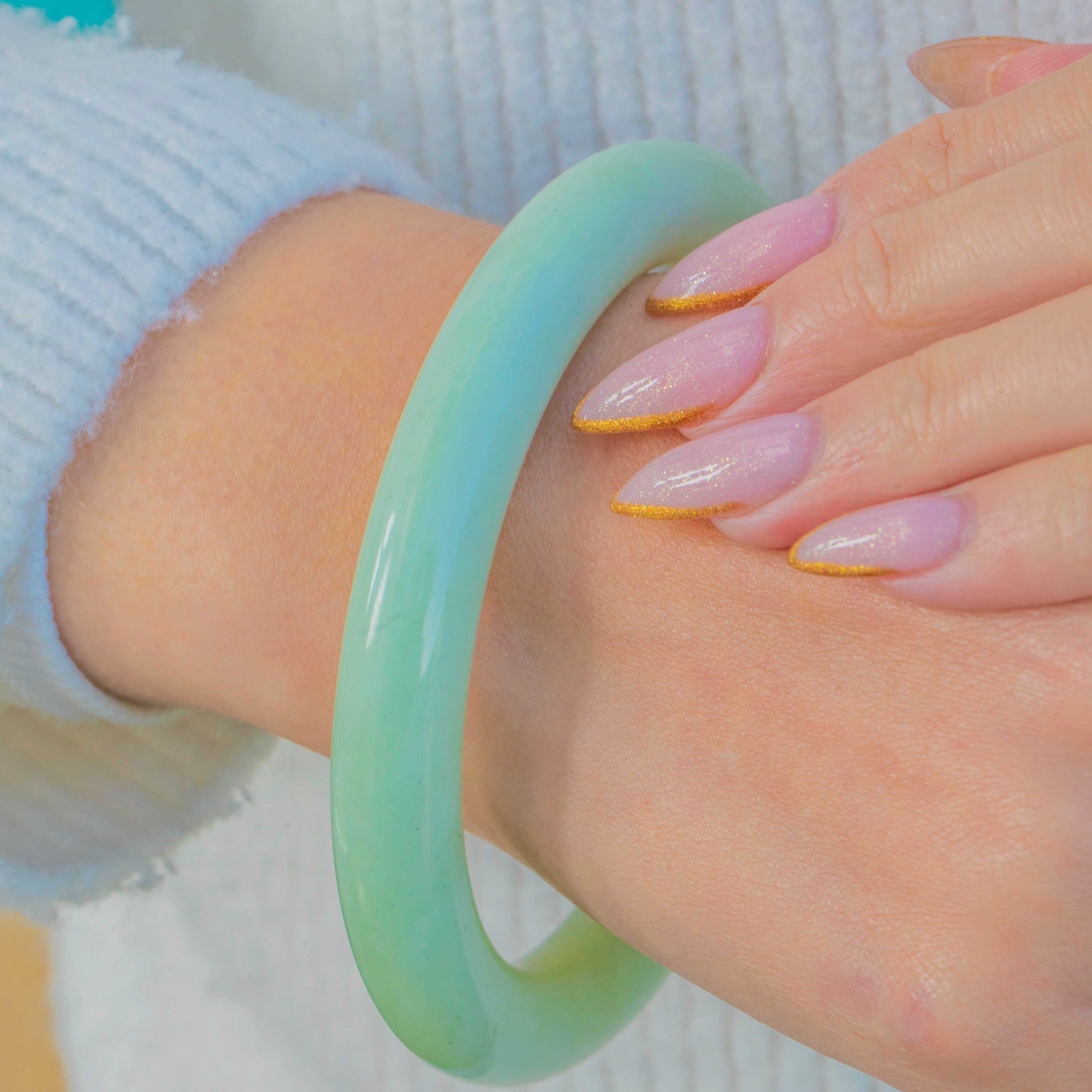 This beautiful vintage Jade bangle has a wonderfully smooth, polished finish and a serene green tone throughout. Its generous width and weight give it a luxurious, substantial feel on the wrist, while the classic rounded profile makes it comfortable for everyday wear.