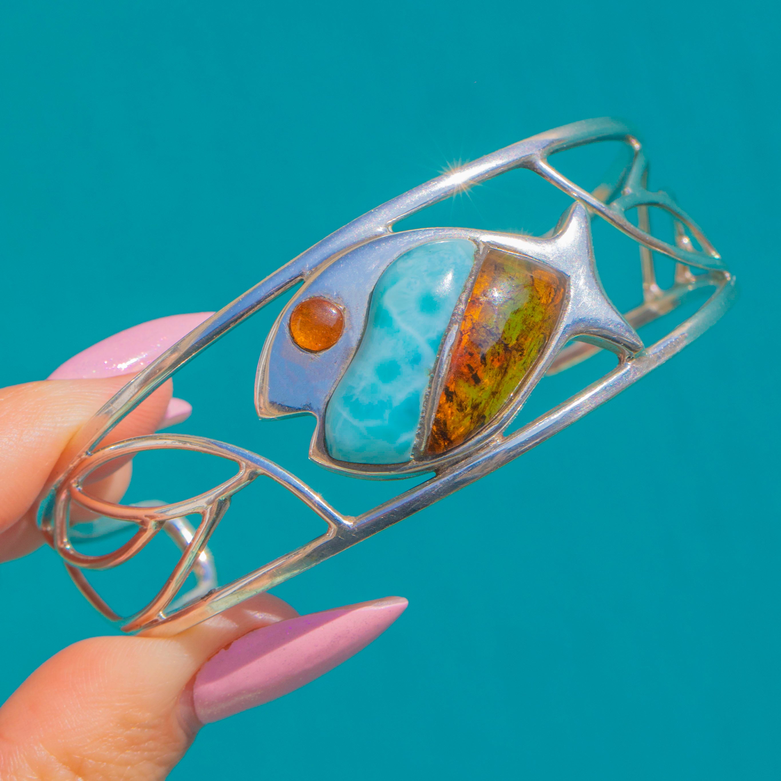 Vintage Silber Armreif mit Bernstein, Howlith & Fisch-Motiv