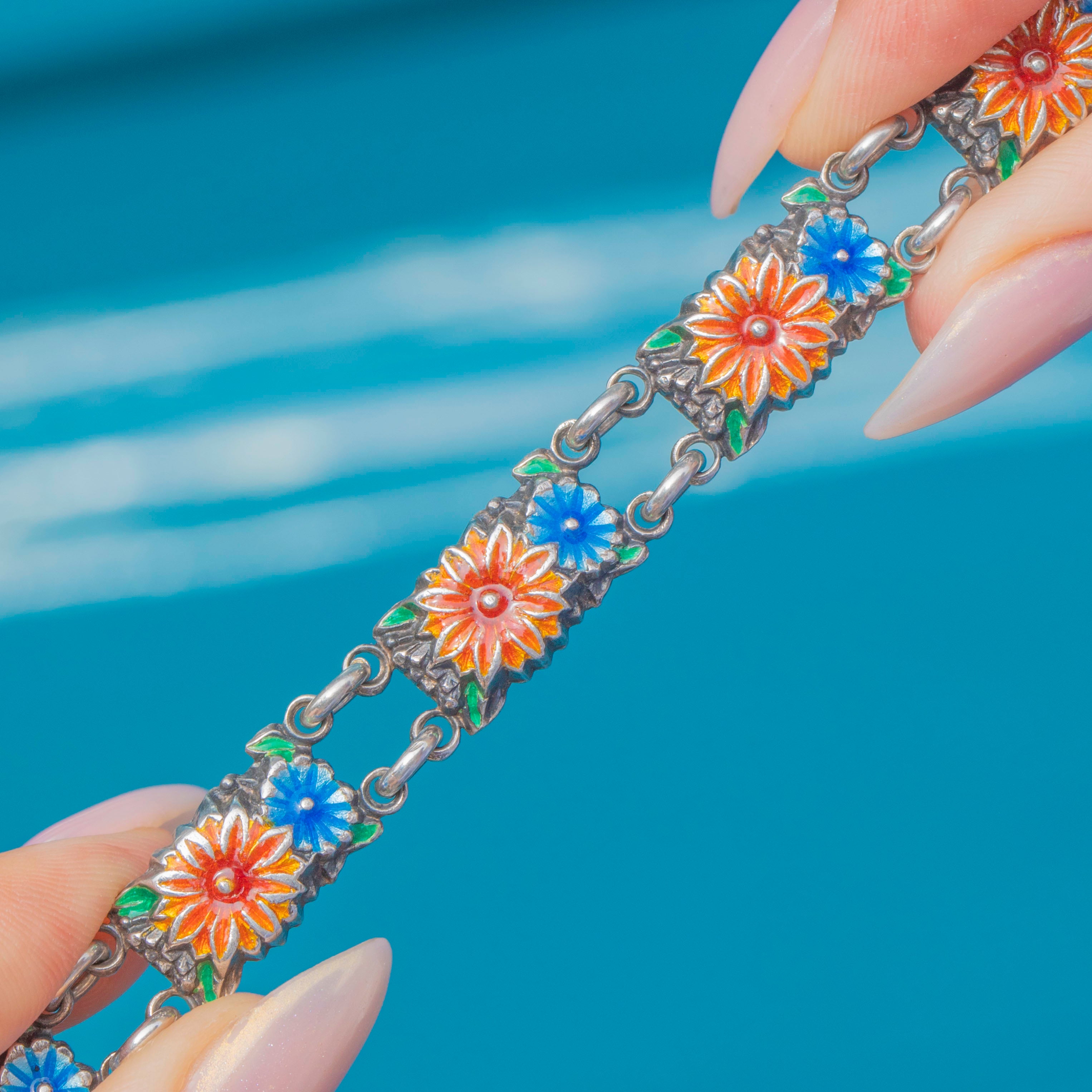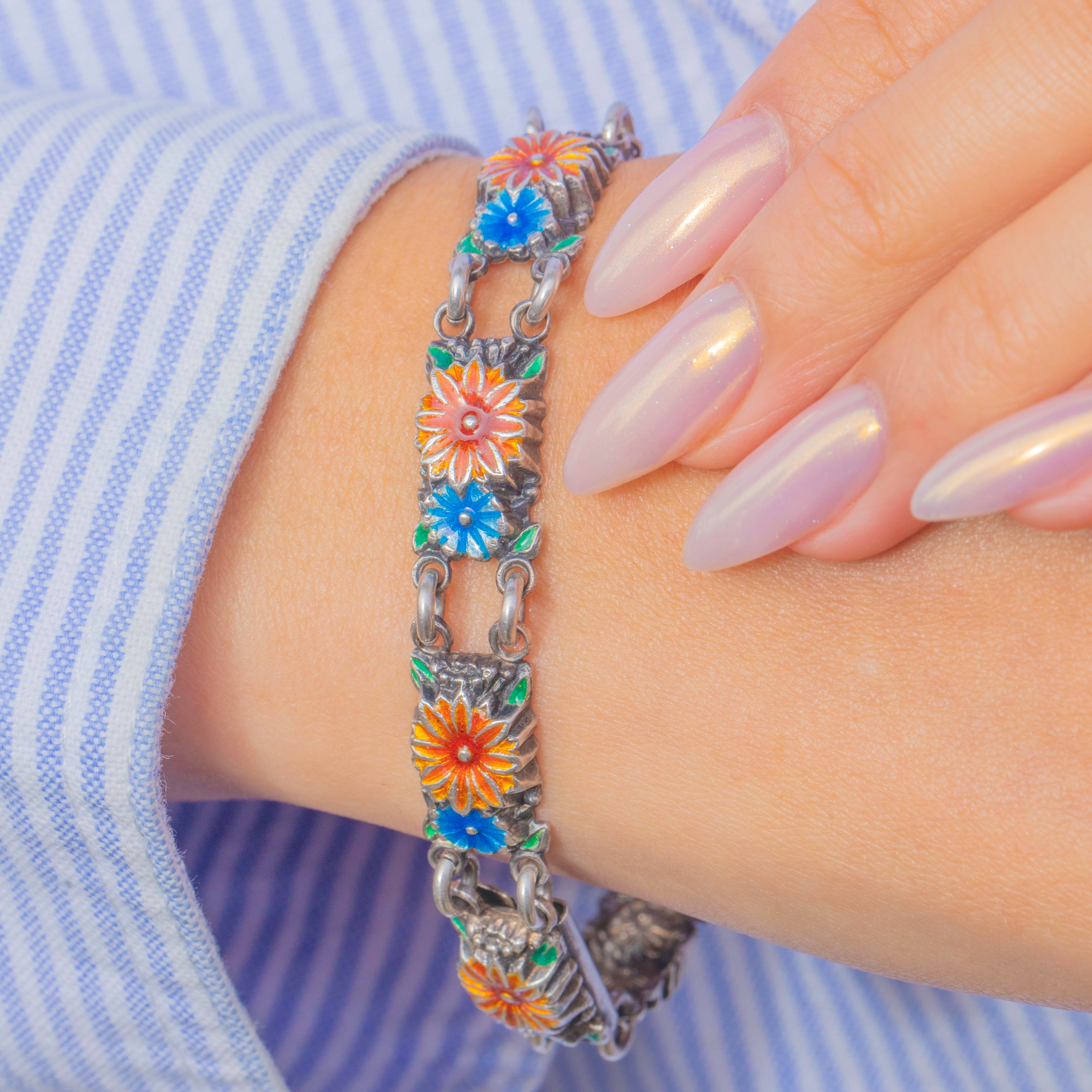 A vibrant Vintage Silver enamel bracelet, decorated with colourful floral motifs across each link. The design features orange-red and soft blue flowers, each framed in green enamel for a charming garden-like effect.