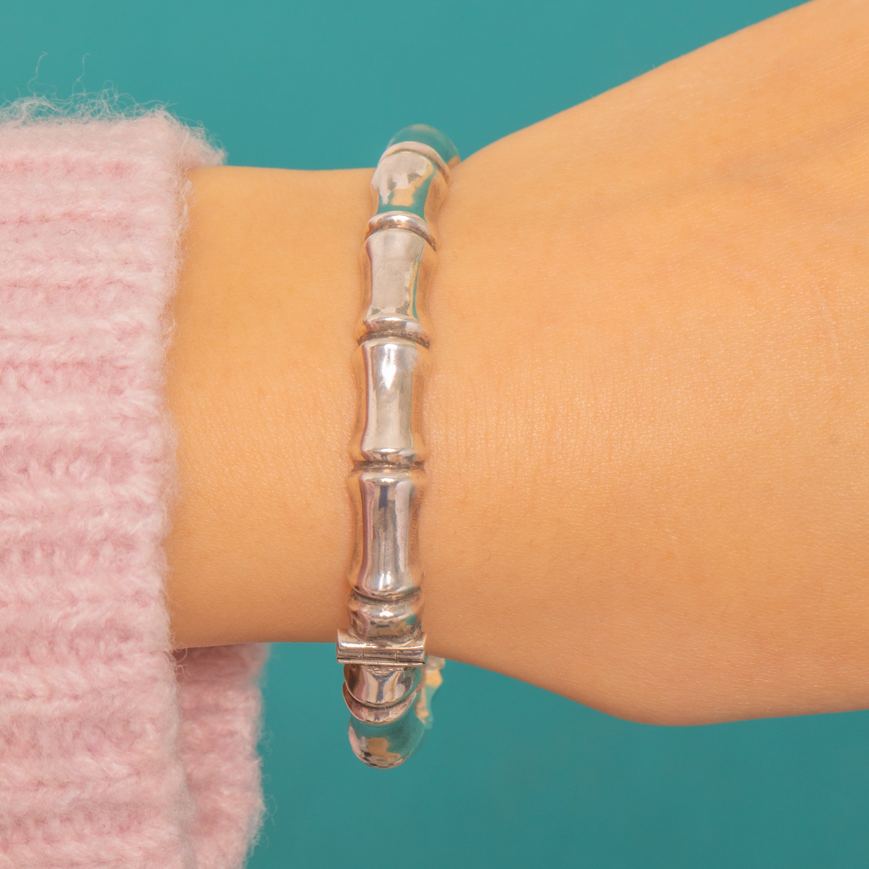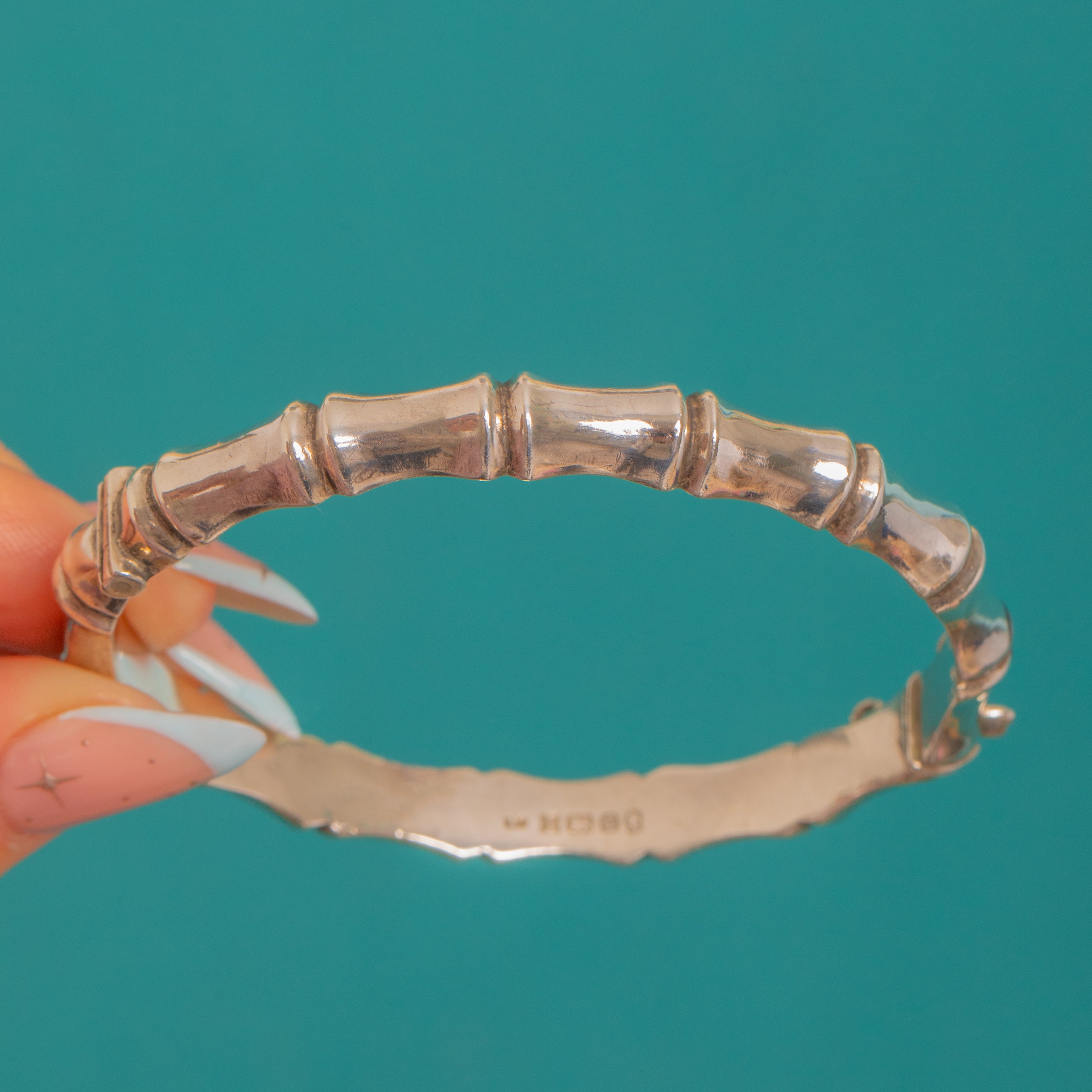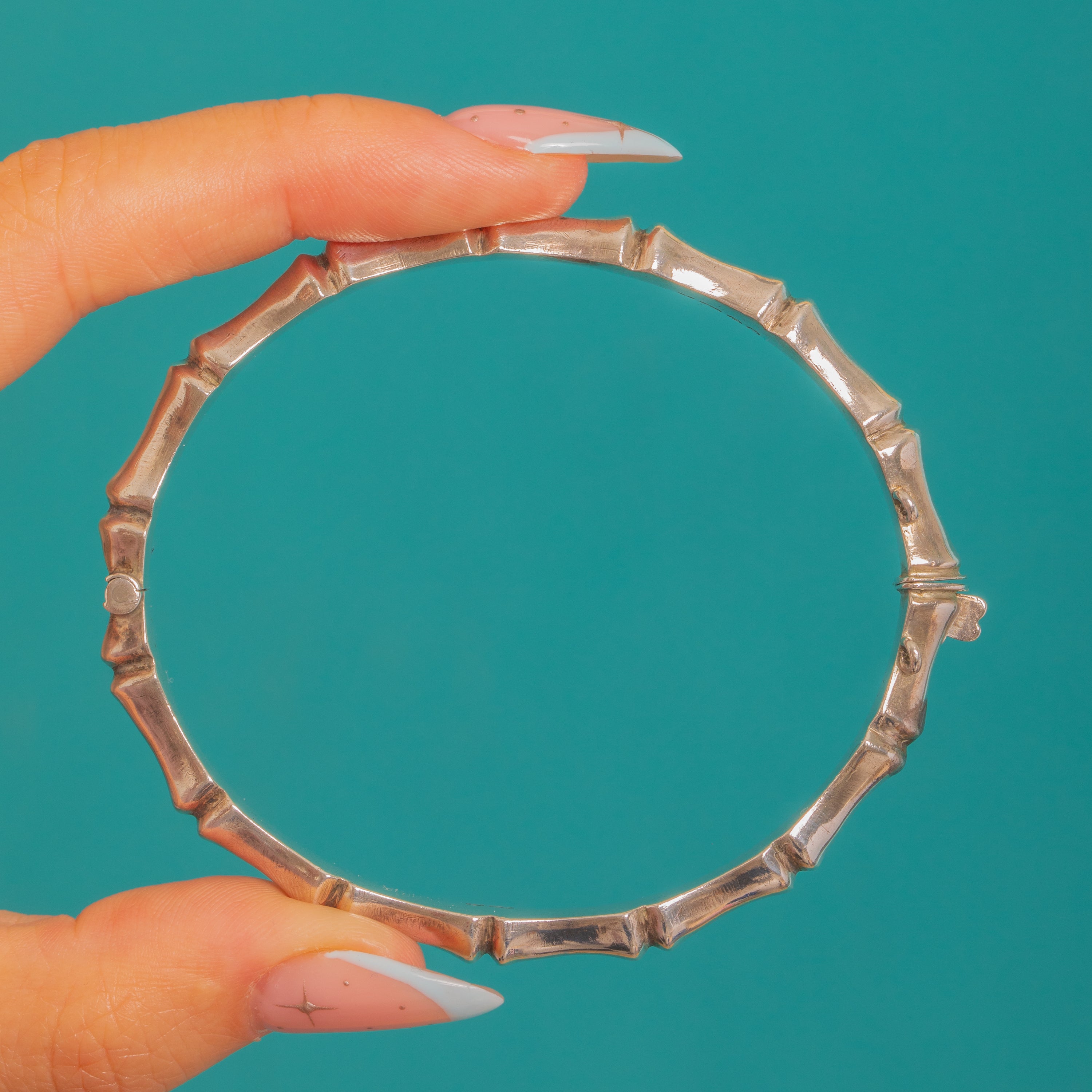 Sleek, sculptural and effortlessly chic, this Vintage Sterling Silver hinged bangle is modelled as segmented bamboo with softly rounded nodes and a luminous high-polish finish. Its oval profile hugs the wrist beautifully, while the concealed tongue-and-box clasp disappears into a bamboo node for a clean, uninterrupted line.