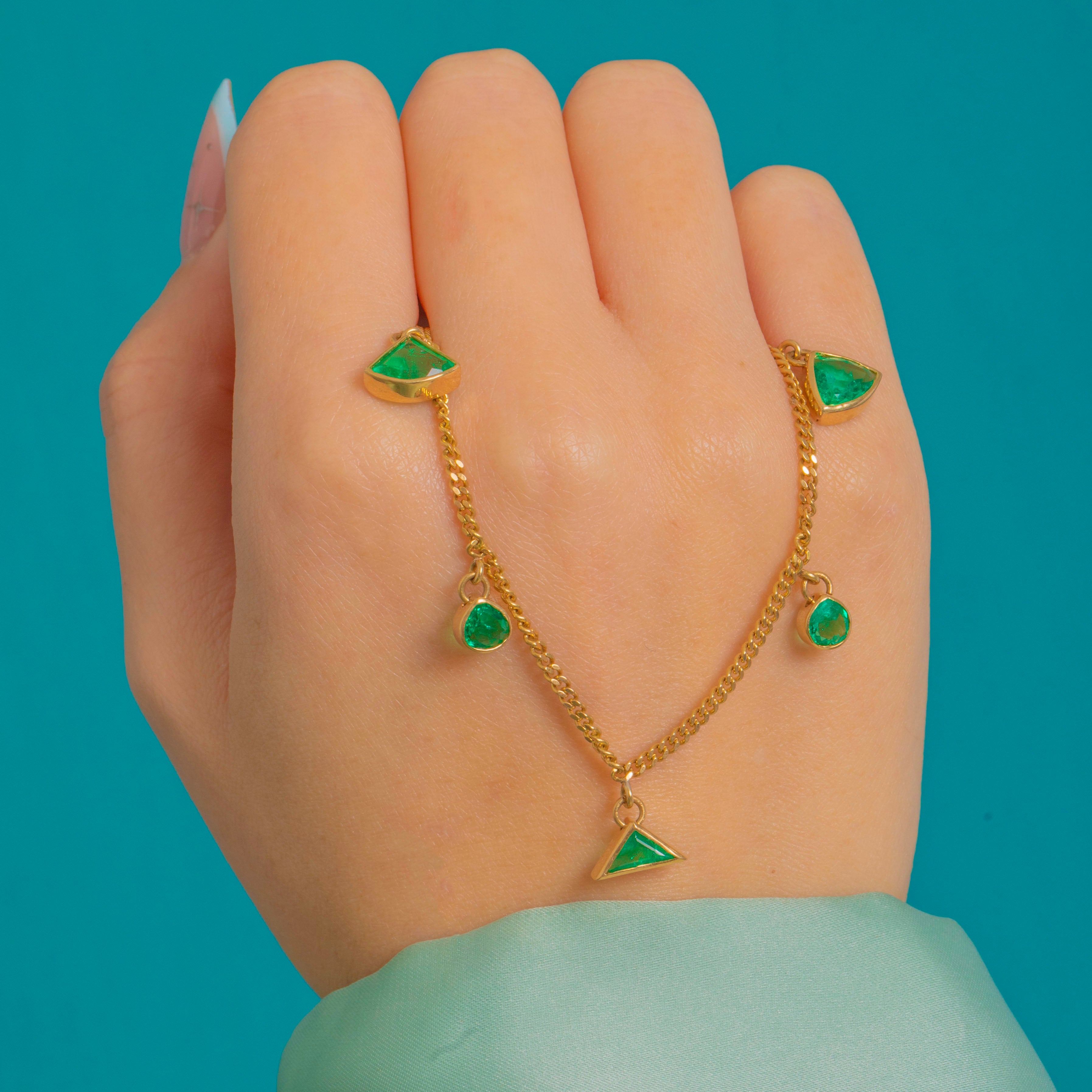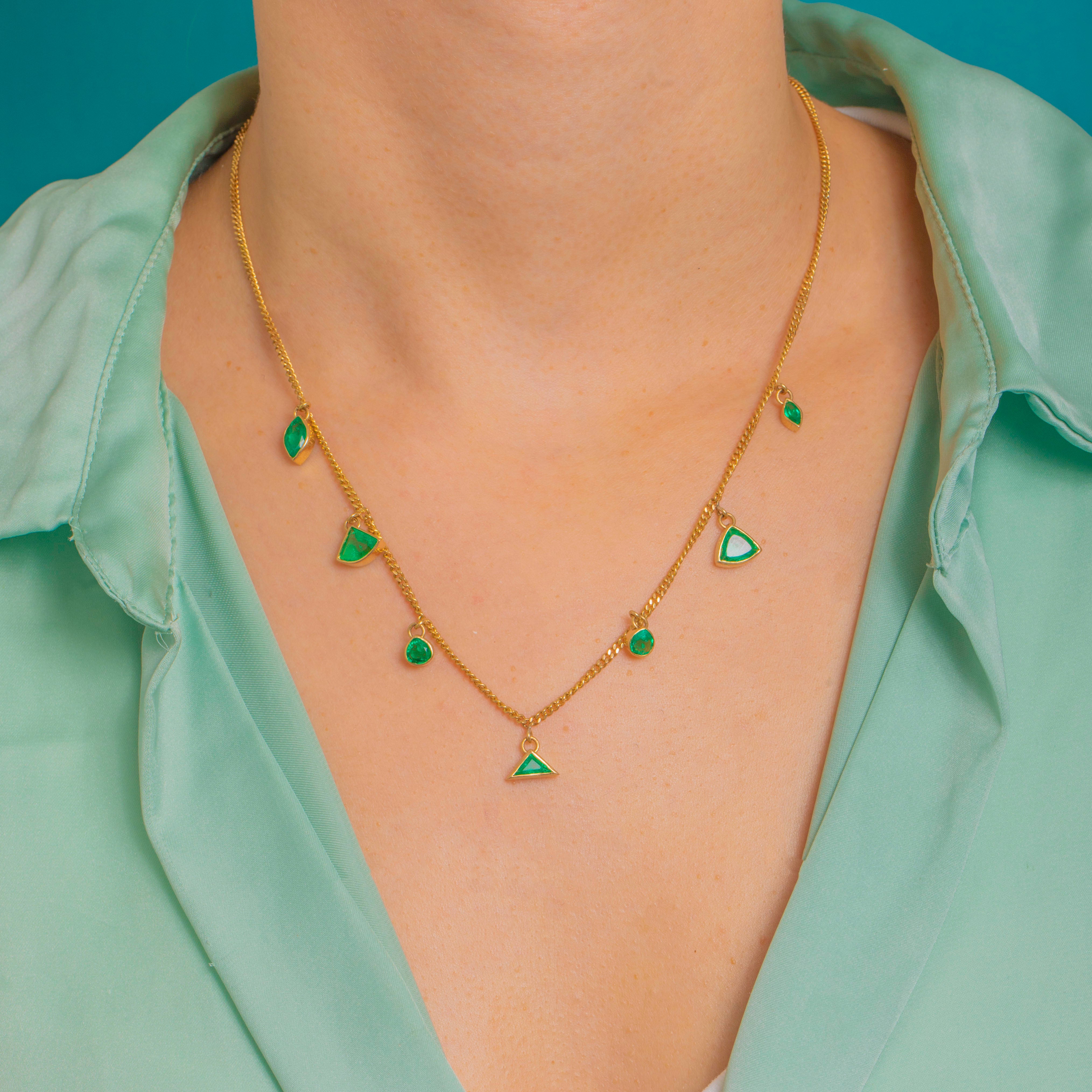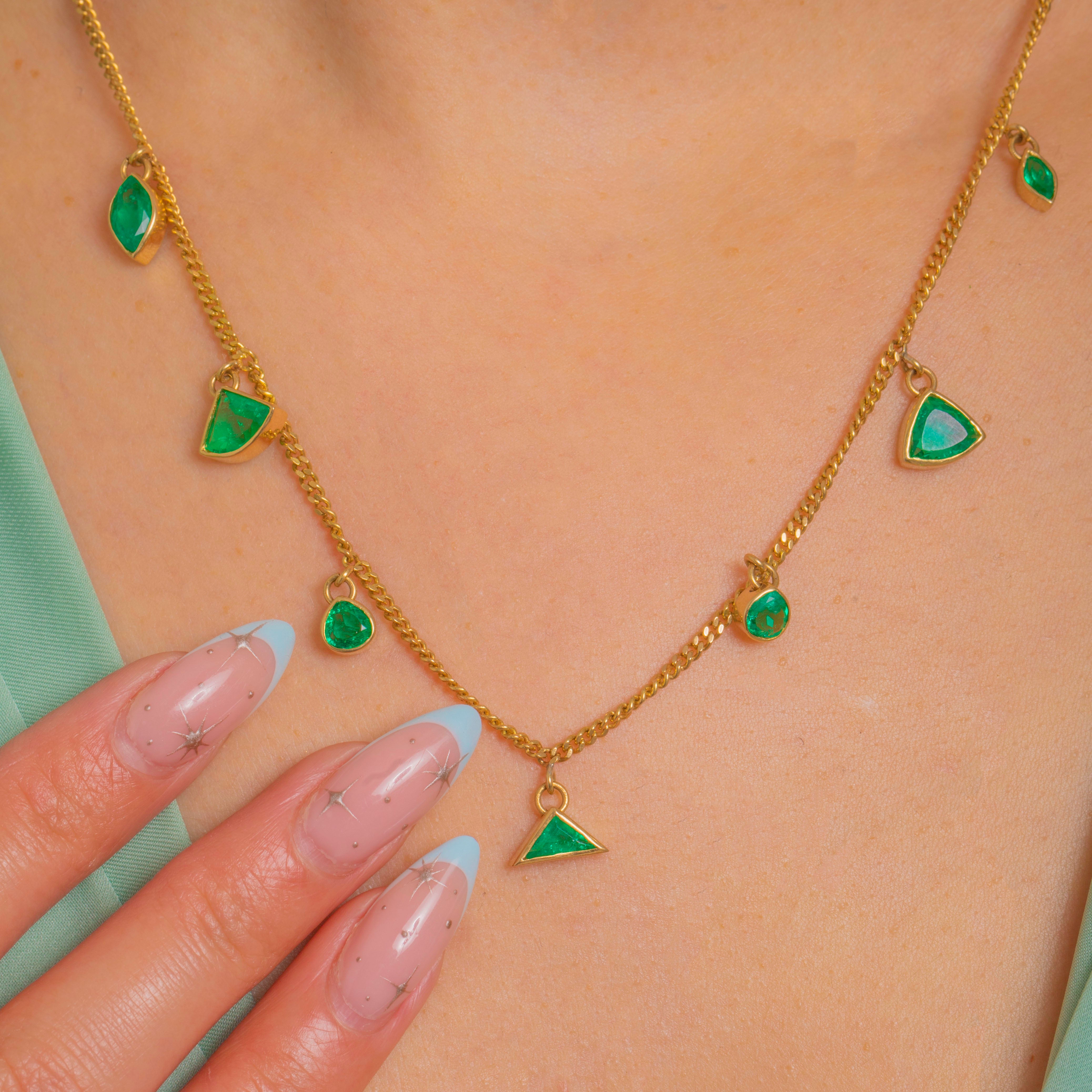 A vivid fringe of Emeralds dances across a fine 18ct Gold curb chain in this elegant Vintage necklace. Each bright green stone is bezel-set and articulated on tiny jump rings for beautiful movement, creating a graceful, geometric station silhouette with a refined, contemporary feel.