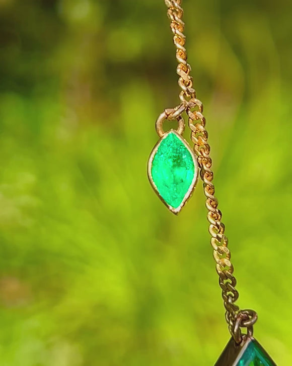 EXCELLENT: Emeralds are bright and well-matched with no obvious chips, only light natural internal characteristics visible under close inspection. The bezels, jump rings and chain are secure and neatly finished, with a crisp polish retained throughout. Clasp is in excellent working order; overall wear is minimal and consistent with careful use.