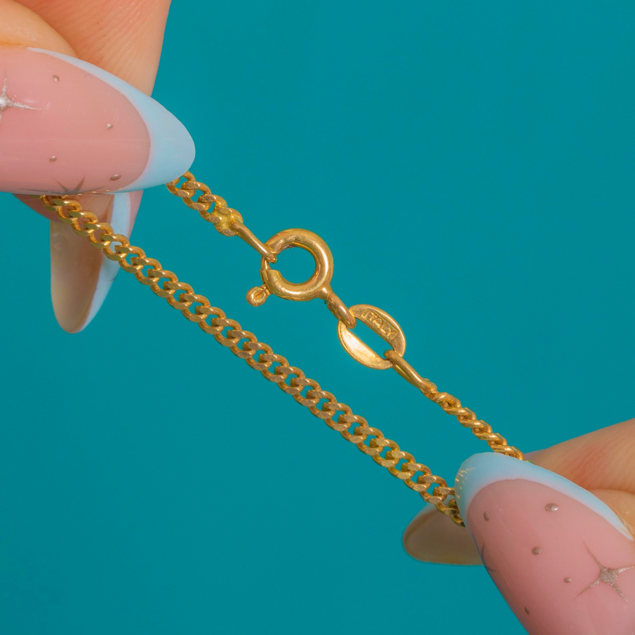 STAMPS: Star stamp, 358, MI, 750, Italy on clasp next to chain.
