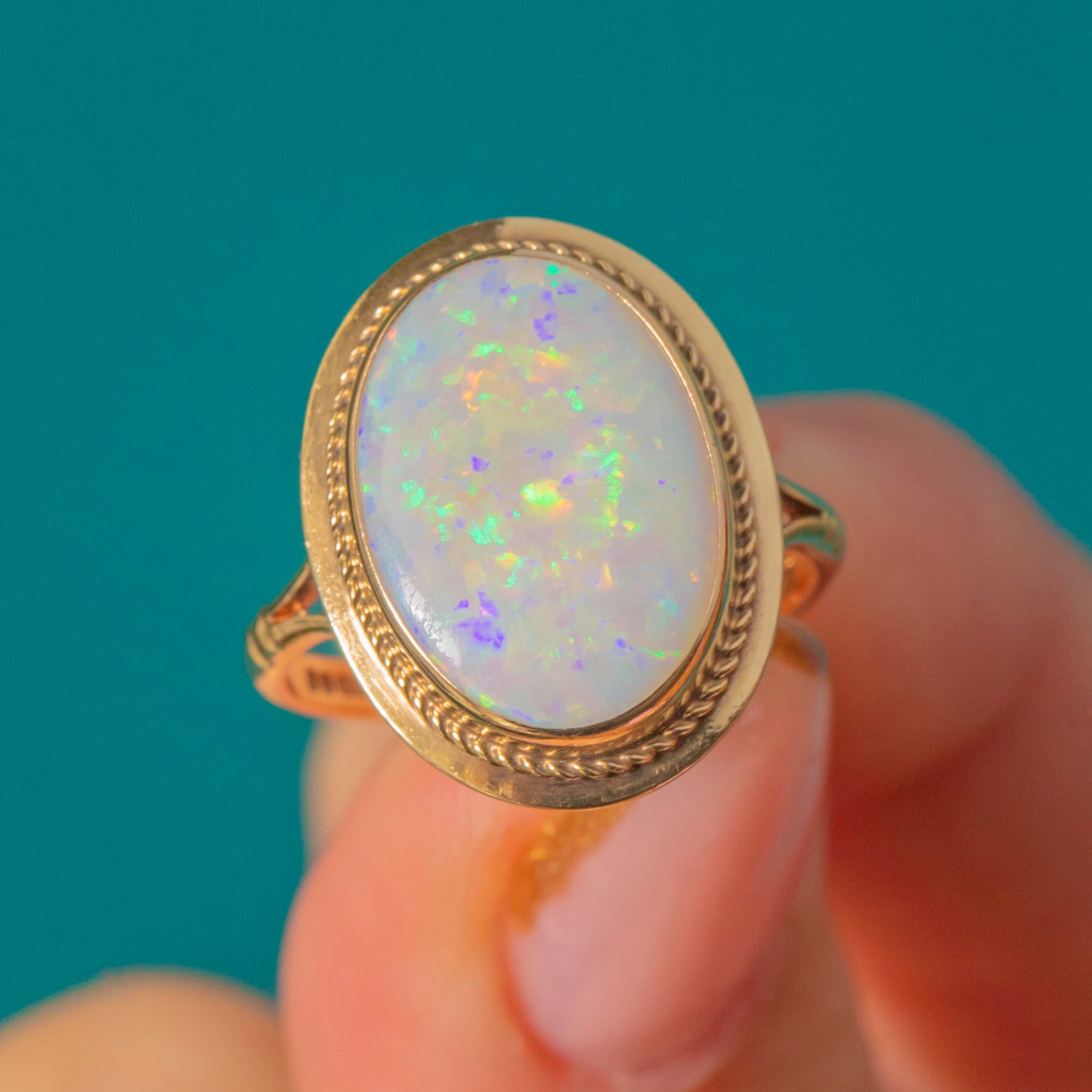 EXCELLENT: The Opal is natural, solid and displays vivid colour play across the surface with no cracks or abrasions visible. The 9ct Gold setting and band are robust and smooth, with clear, crisp English hallmarks dating the ring precisely to 1980.