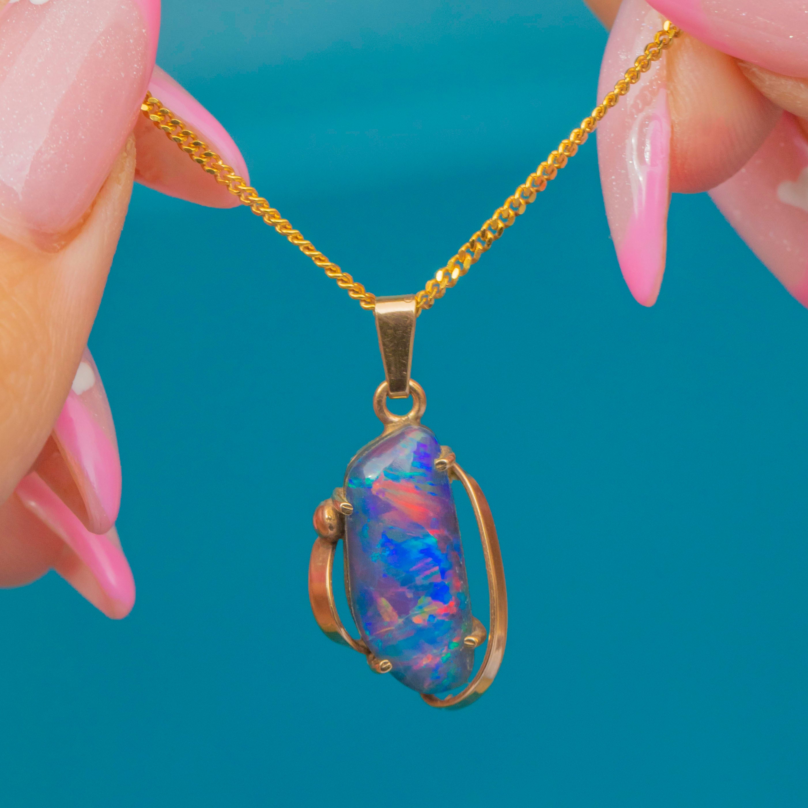 This striking pendant showcases a vivid Opal triplet bursting with electric flashes of blue, pink and green. The Opal’s dramatic play-of-colour is beautifully enhanced by its sculptural 9ct Gold setting, complete with decorative side detailing that flows around the gem like liquid Gold.