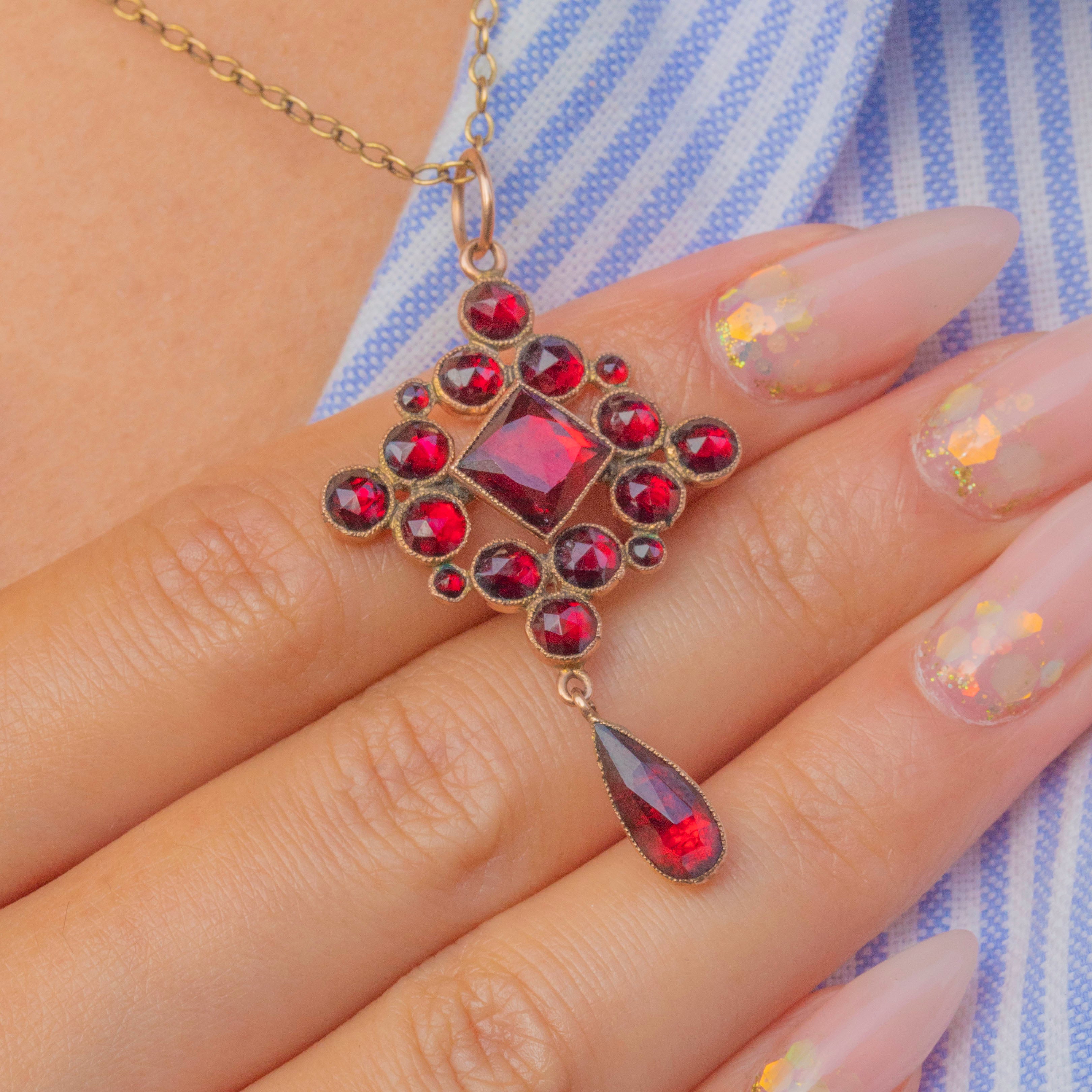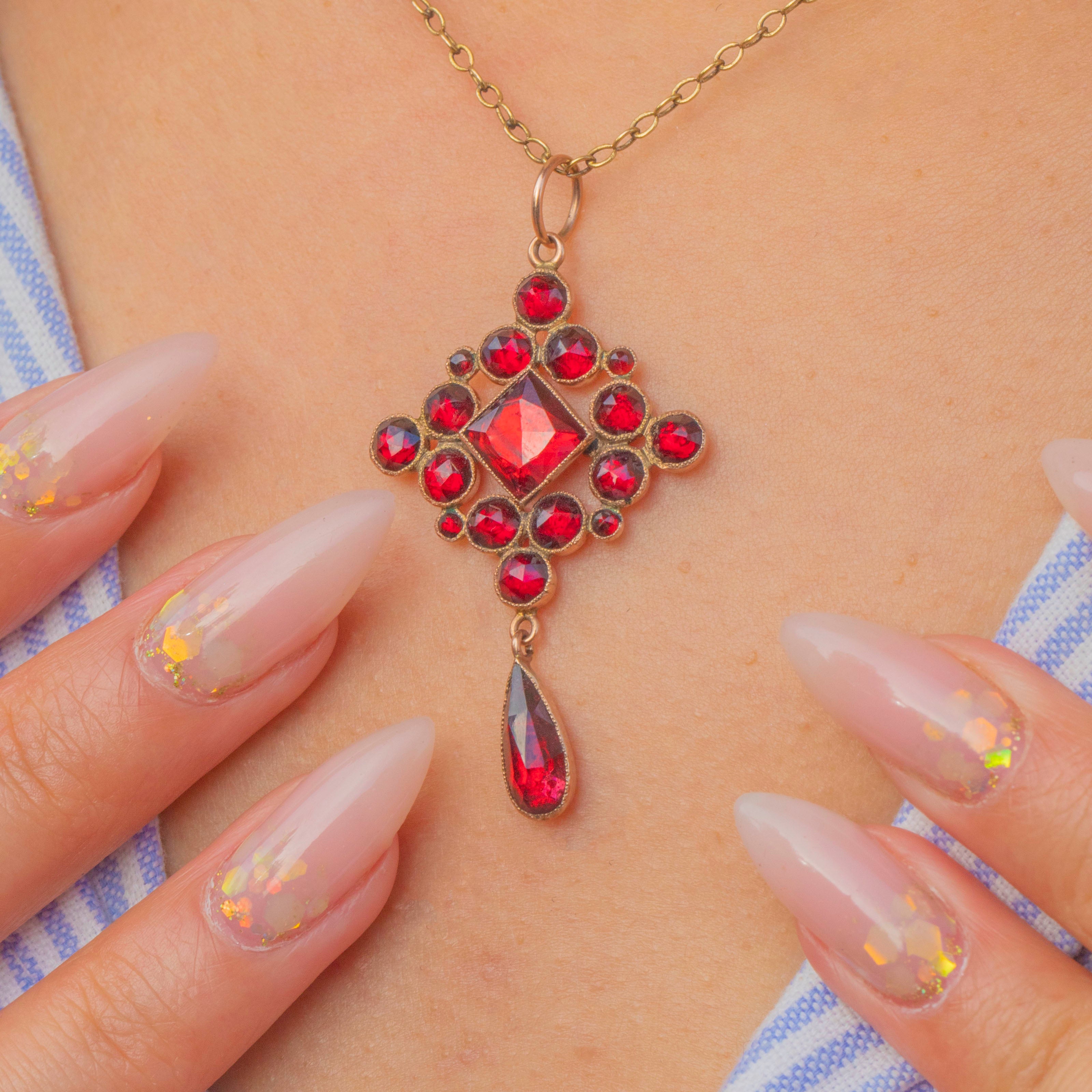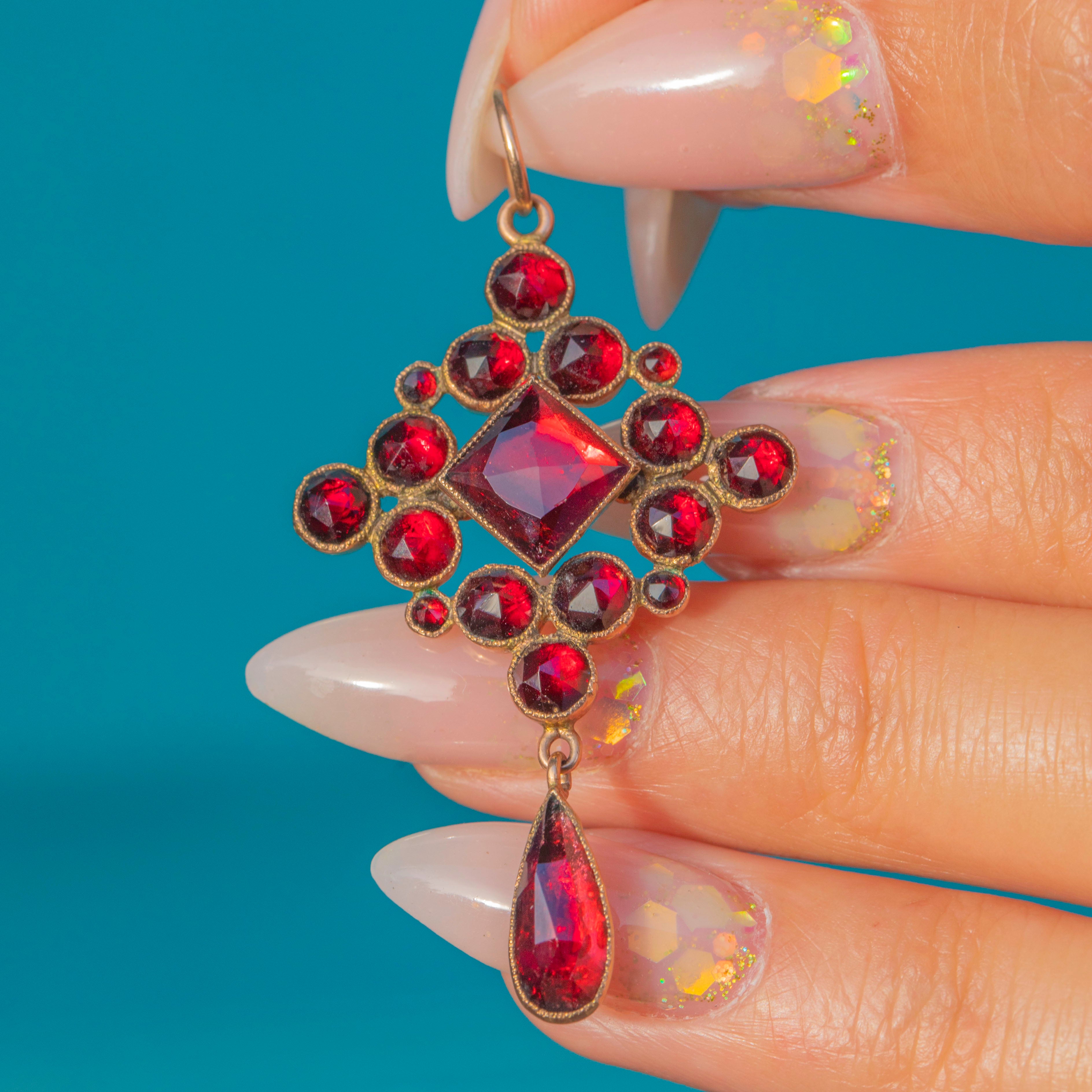 This striking Victorian pendant is set with a vibrant array of foiled-back rose-cut Garnets, their rich red tones glowing beautifully in the light. The central square-cut Garnet is surrounded by an arrangement of round Garnets and finished with a dramatic pear-shaped drop.