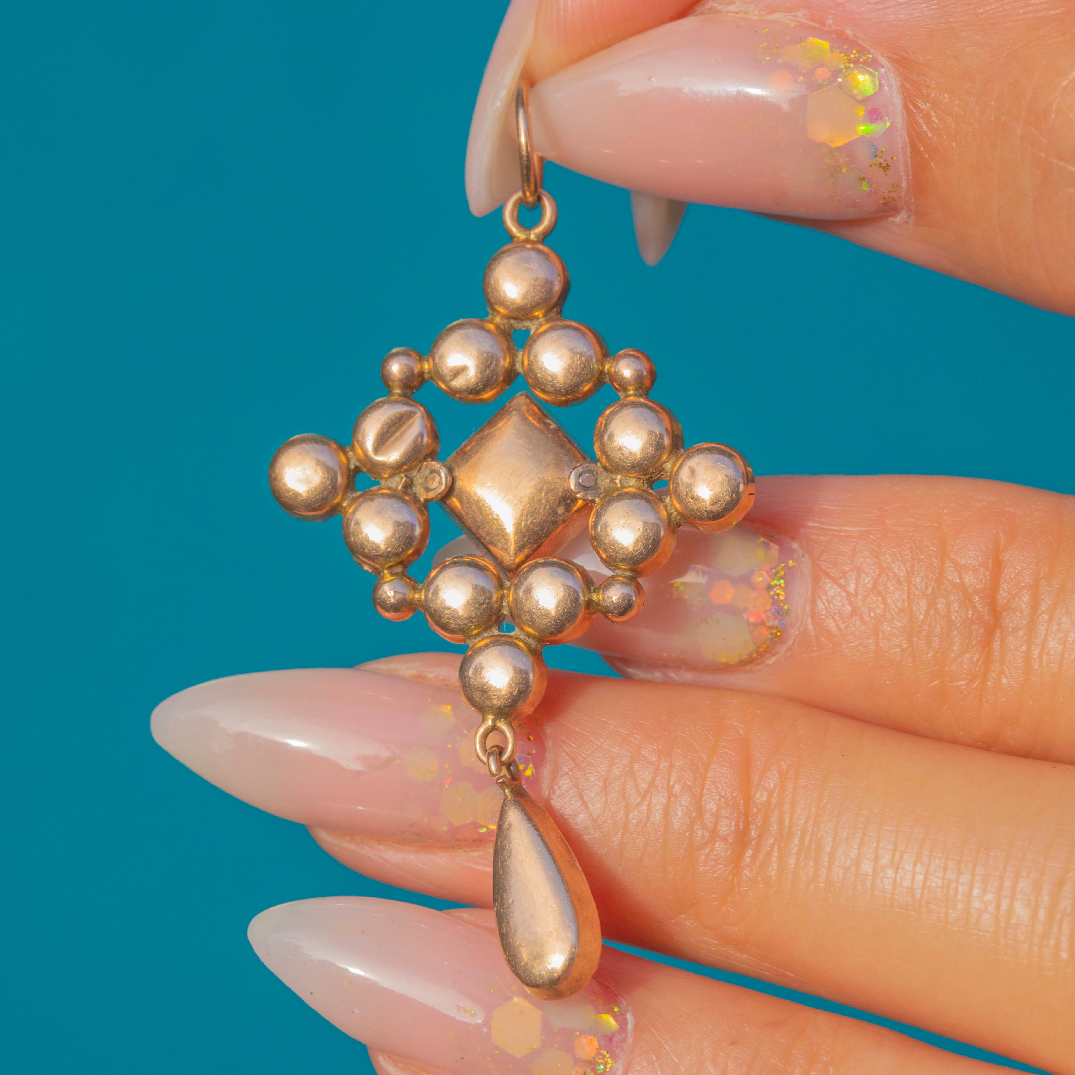 Crafted in warm 9ct Gold, this antique Garnet pendant is a stunning example of mid-Victorian design. At 45mm long including the jump ring, it will make an eye-catching statement when worn on a fine Gold chain.
